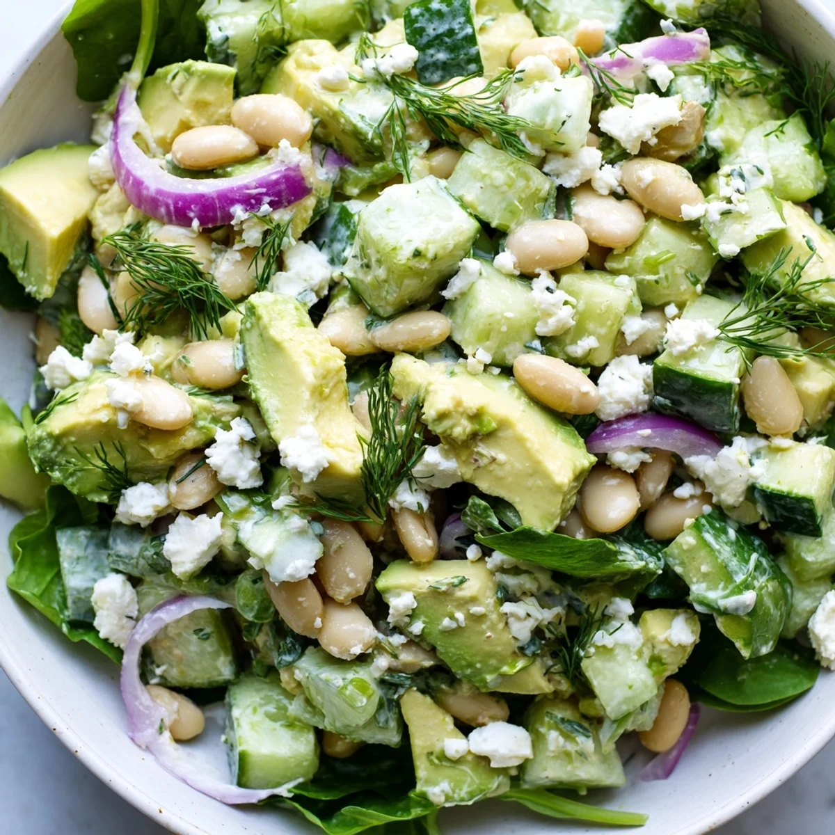 This vibrant bowl combines ripe avocado's creaminess with crisp cucumber, hearty white beans, and aromatic fresh dill. The tangy yogurt dressing brings everything together with bright lemon and garlic notes.