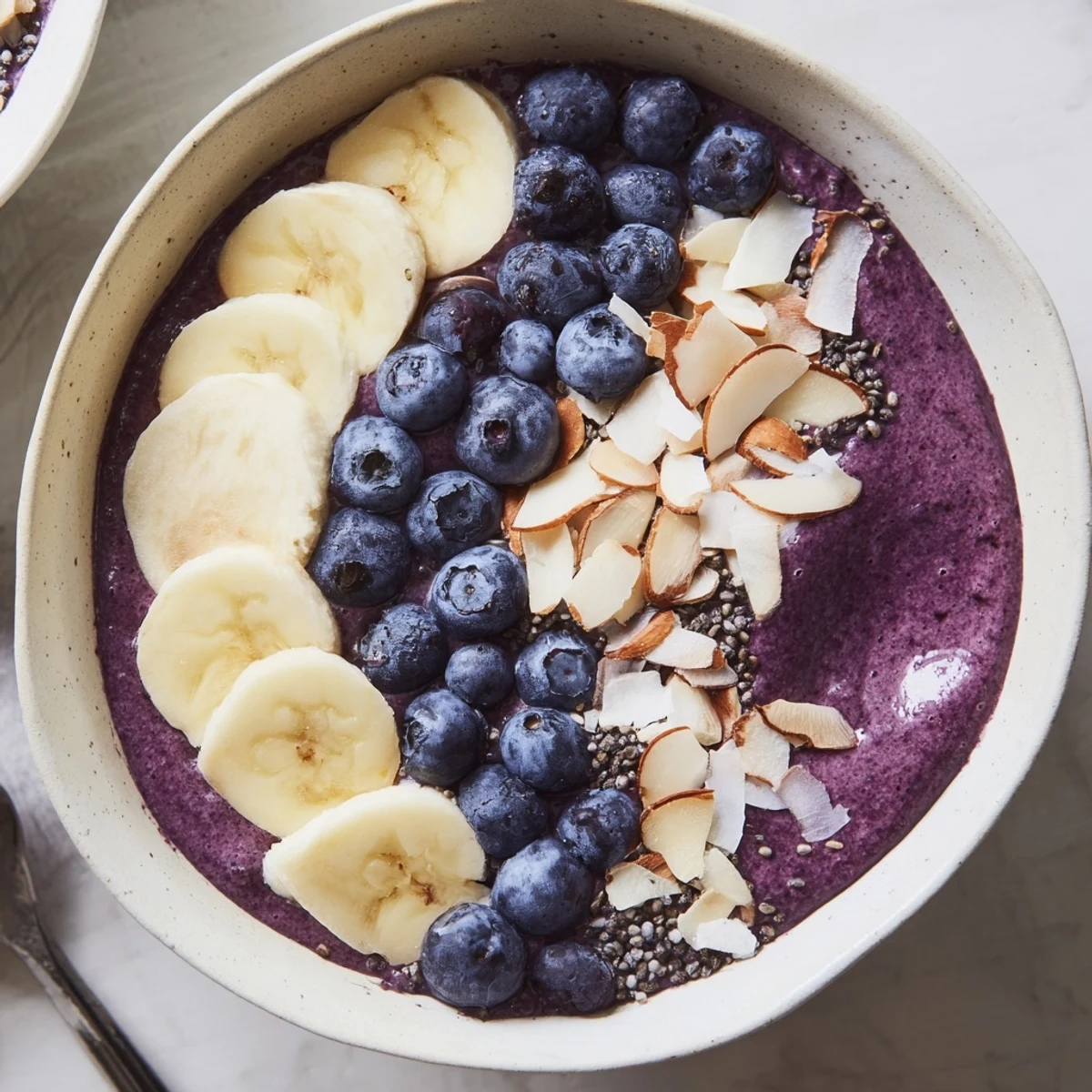 This vibrant smoothie bowl combines frozen blueberries and ripe banana with creamy almond butter for a thick, spoonable base.