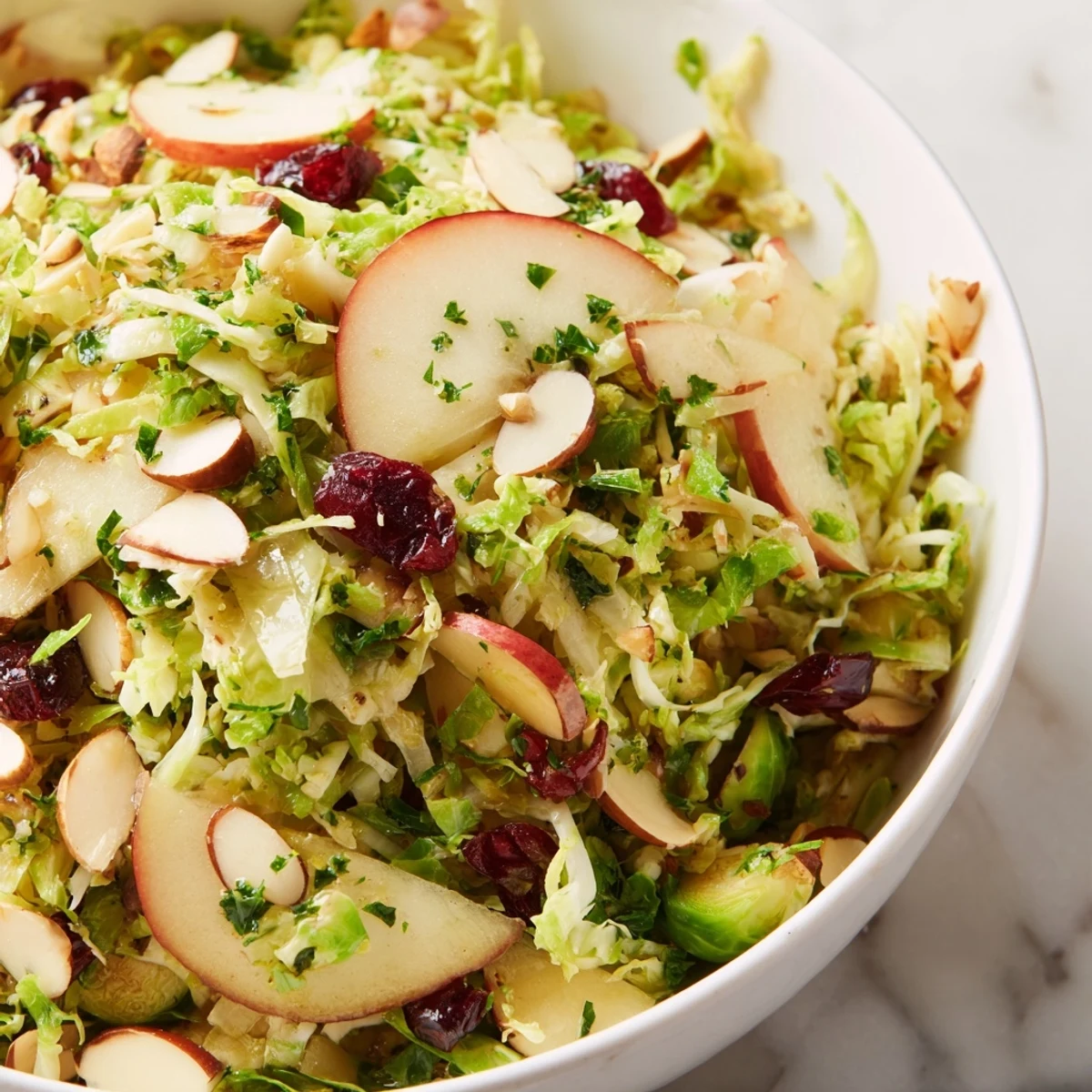 This vibrant bowl combines thinly shaved Brussels sprouts with crisp apple slices, toasted almonds, and dried cranberries for a perfect balance of textures. The sweet-tangy maple dressing ties everything together with olive oil, apple cider vinegar, and Dijon mustard. Ready in just 25 minutes, this nourishing dish works beautifully as a light lunch or refreshing side.