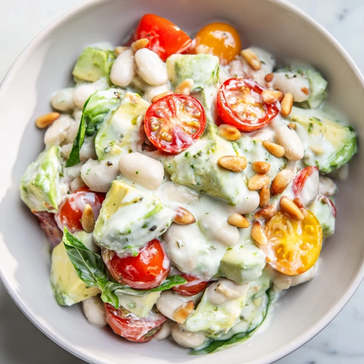 This vibrant bowl combines protein-rich white beans with creamy avocado, sweet cherry tomatoes, and fragrant fresh basil. The tangy Greek yogurt dressing ties everything together, creating a satisfying meal that comes together in just 15 minutes. Perfect for lunch or as a hearty side, this dish offers a balance of protein, healthy fats, and fresh vegetables.