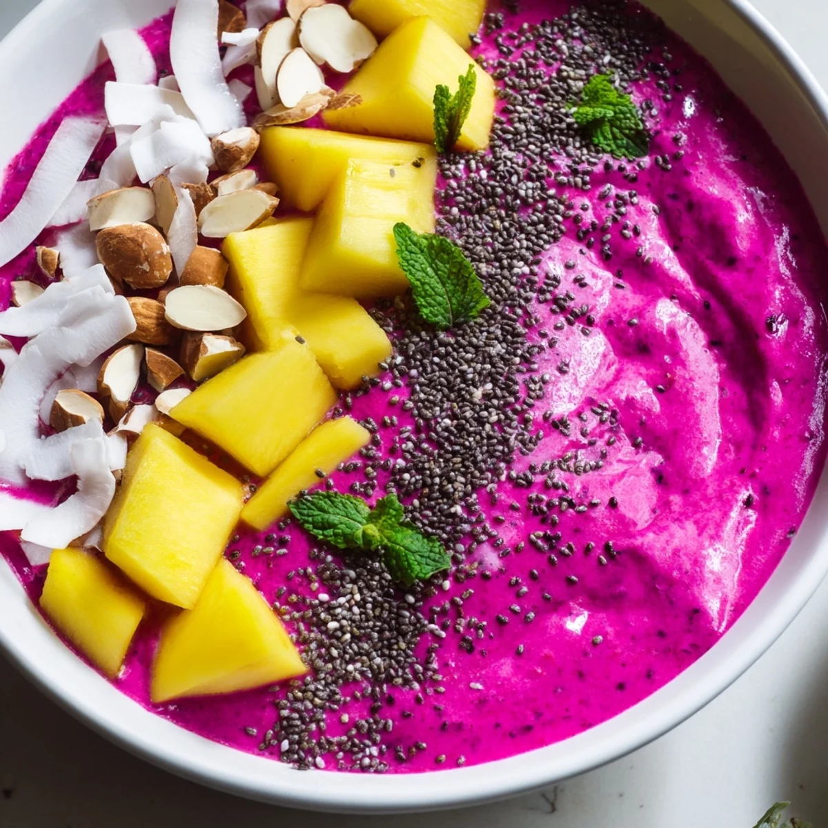 This vibrant tropical bowl combines frozen dragon fruit and sweet mango with creamy coconut milk and yogurt for a luscious base. The thick, smooth mixture gets topped with fresh diced fruit, toasted coconut flakes, and roasted almonds for satisfying crunch. Ready in just 10 minutes, this plant-based, gluten-free bowl makes an ideal refreshing breakfast or wholesome snack. The natural sweetness comes from ripe fruit, with optional maple syrup and bright lime juice to enhance flavors. Chia seeds add extra nutrition while fresh mint leaves provide a beautiful finishing touch.