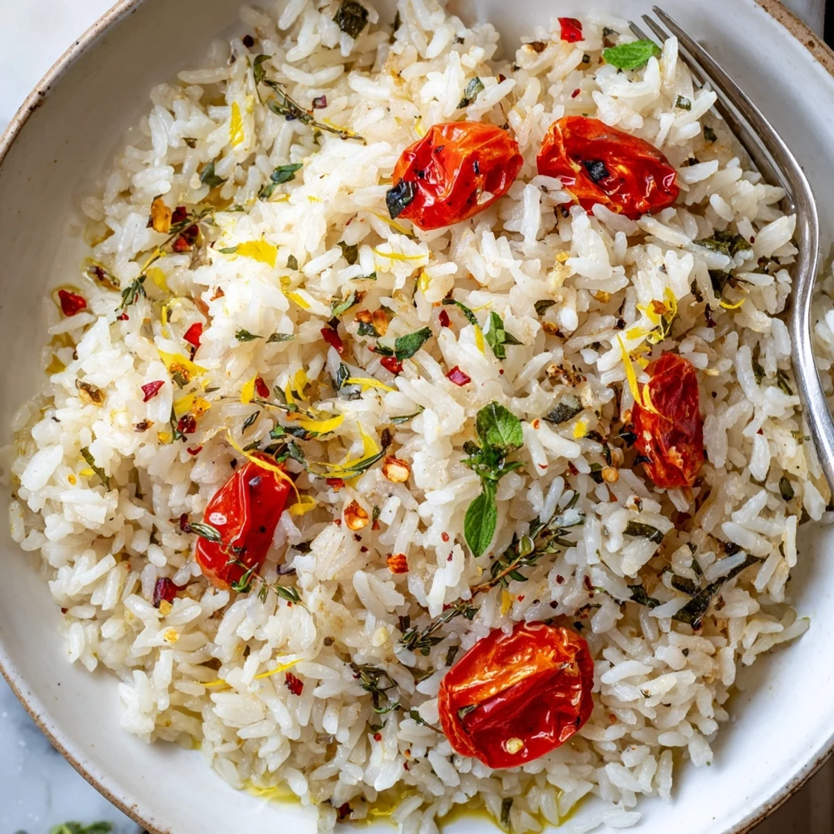 Toast jasmine rice briefly, simmer until tender, then fluff and fold in a garlic, butter and fresh herb mixture brightened with lemon zest. Halved cherry tomatoes are roasted until caramelized and spooned over the warm rice. Ready in about 45 minutes, this gluten-free, vegetarian option pairs well with grilled proteins or wilted greens.