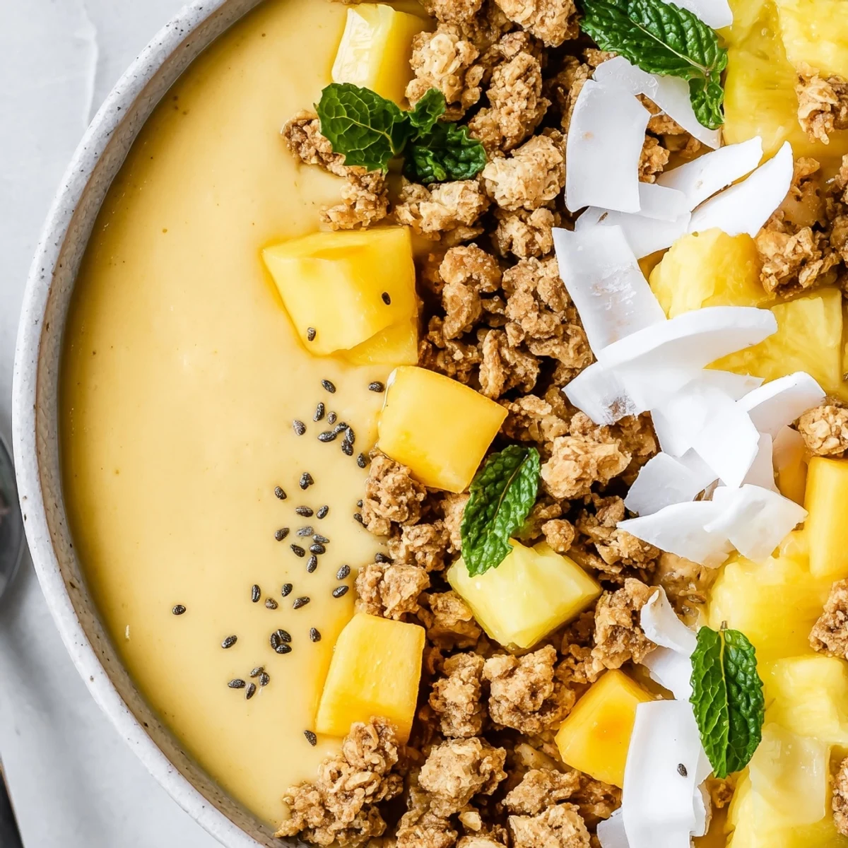 This tropical smoothie bowl combines frozen mango and pineapple with creamy coconut milk for a refreshing, nutrient-packed breakfast.