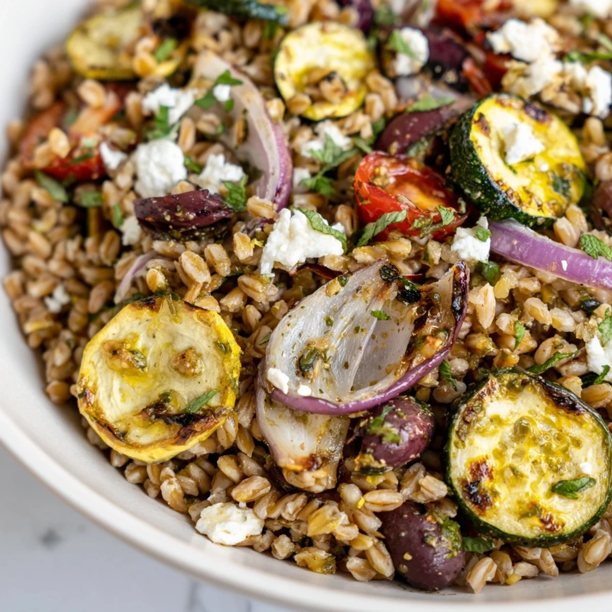 This wholesome Mediterranean bowl combines chewy farro with golden roasted zucchini, blistered cherry tomatoes, and savory red onions. The nutty grains get a bright lift from fresh parsley and mint, while Kalamata olives add briny depth. A zesty lemon-oregano dressing ties everything together, and creamy feta crowns each serving. Ready in under an hour, this nourishing bowl works beautifully for meal prep and tastes wonderful warm or at room temperature.
