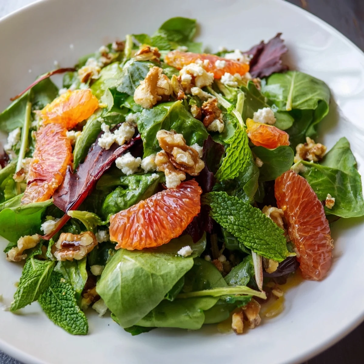 This vibrant salad combines fresh mixed greens with toasted nuts and juicy citrus segments. The homemade dressing blends olive oil with fresh citrus juices, honey, and Dijon mustard for a perfectly balanced flavor profile. Ready in just 20 minutes, it's an ideal light lunch or side dish that's both vegetarian and gluten-free. The optional feta cheese adds a creamy element, while fresh herbs provide a fragrant finish.