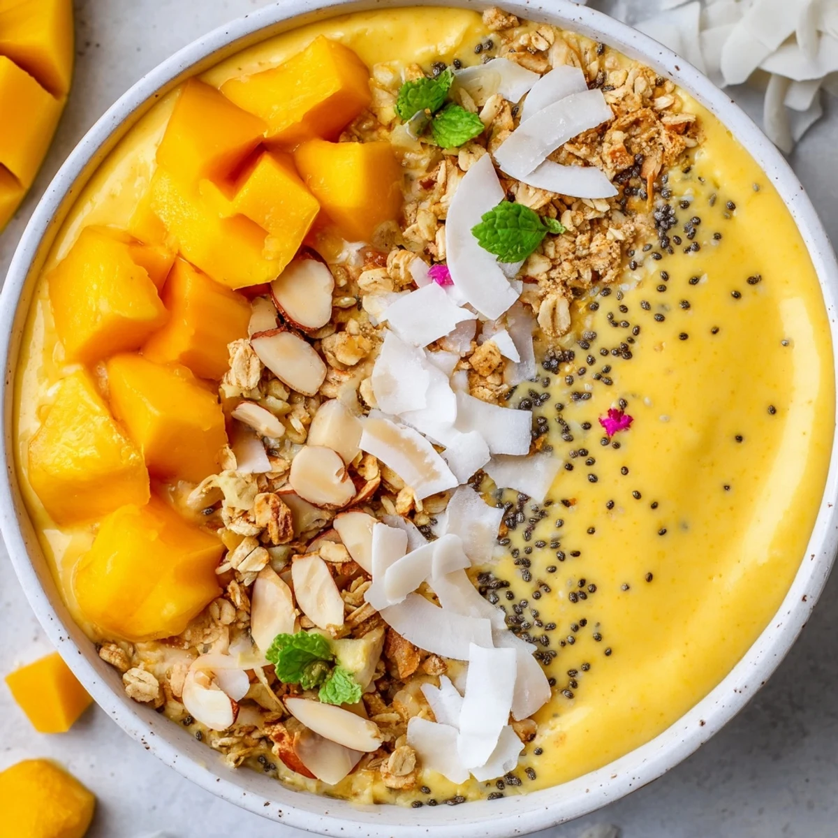 This vibrant tropical bowl brings together frozen pineapple and mango blended with creamy coconut milk and yogurt for a smooth, refreshing base. The chia crunch topping adds satisfying texture with shredded coconut, sliced almonds, and toasted granola, while fresh diced fruit crowns the bowl. Ready in just 10 minutes, this nourishing breakfast or snack delivers natural sweetness, healthy fats, and fiber to keep you energized throughout the morning.