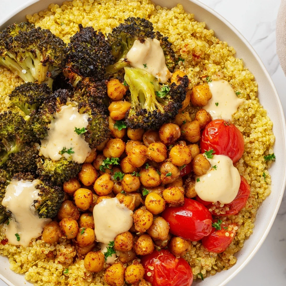 - Portion quinoa into bowls and top with roasted broccoli, chickpeas, cherry tomatoes and parsley