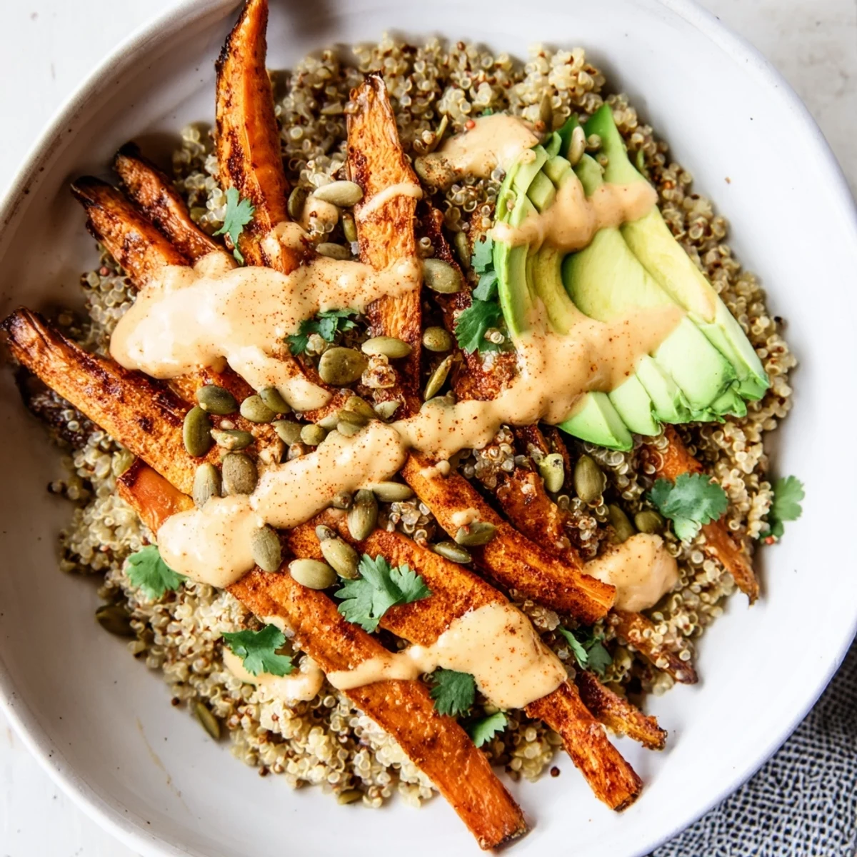 This vibrant bowl combines tender roasted carrots seasoned with fresh ginger, cumin, and smoked paprika over fluffy quinoa. The citrus tahini dressing brings brightness with orange and lemon juice, while avocado adds creaminess. Perfect for meal prep and easily customizable with chickpeas or sweet potatoes.