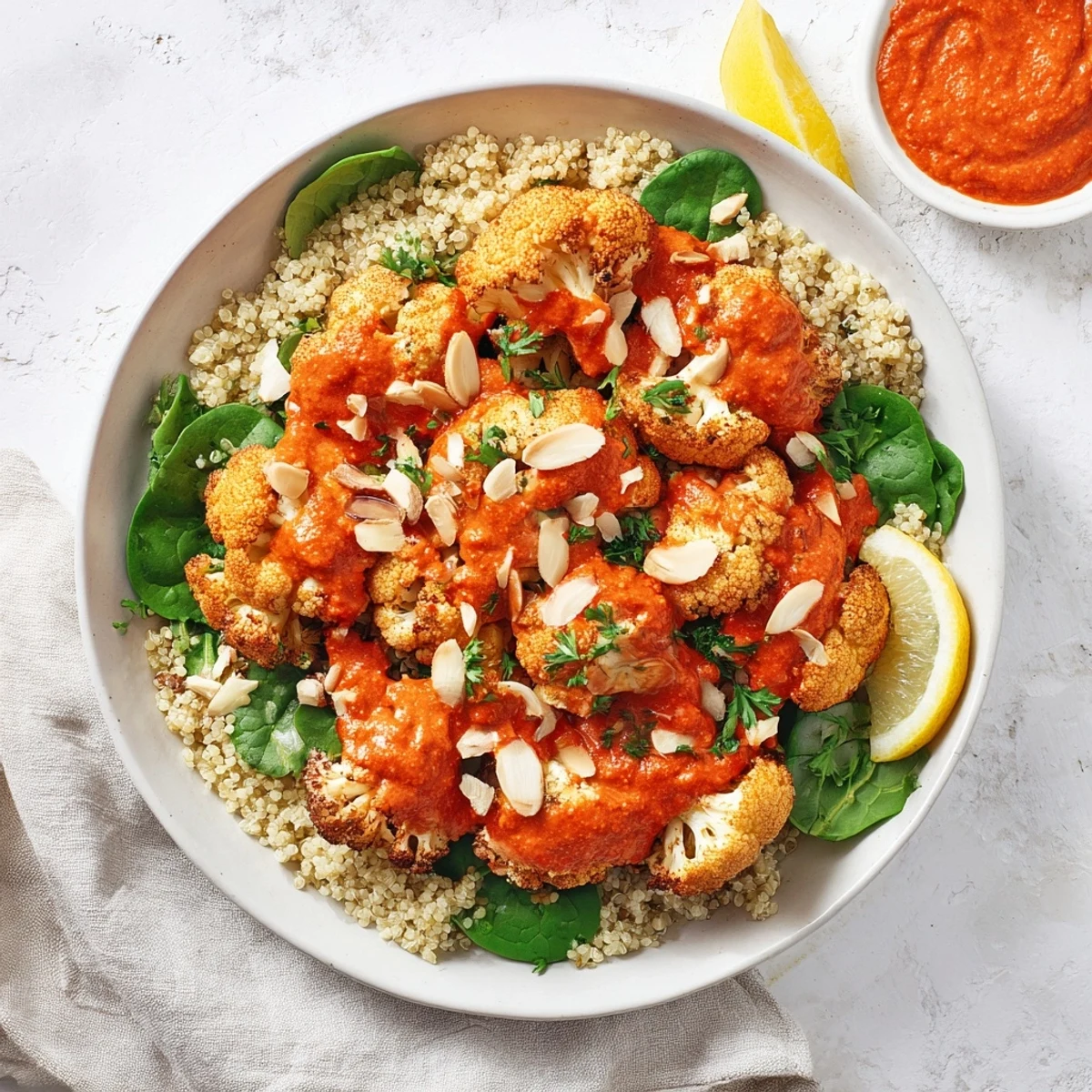 - Divide the fluffy quinoa among four bowls and arrange the roasted cauliflower and greens on top. Drizzle generously with romesco sauce and finish with a scattering of almond crunch, fresh parsley, and lemon wedges.