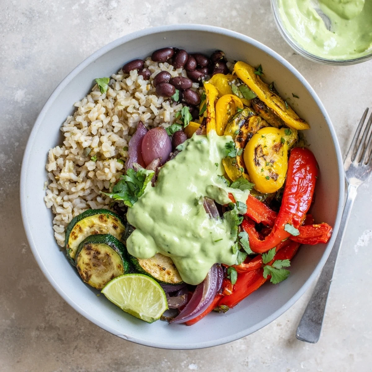 The star of this dish is the creamy avocado topping—blended with yogurt, fresh cilantro, and lime juice for a cool, tangy contrast to the spiced roasted vegetables. Served over fluffy brown rice or quinoa and topped with warmed black beans, each bowl delivers a satisfying mix of textures and flavors.