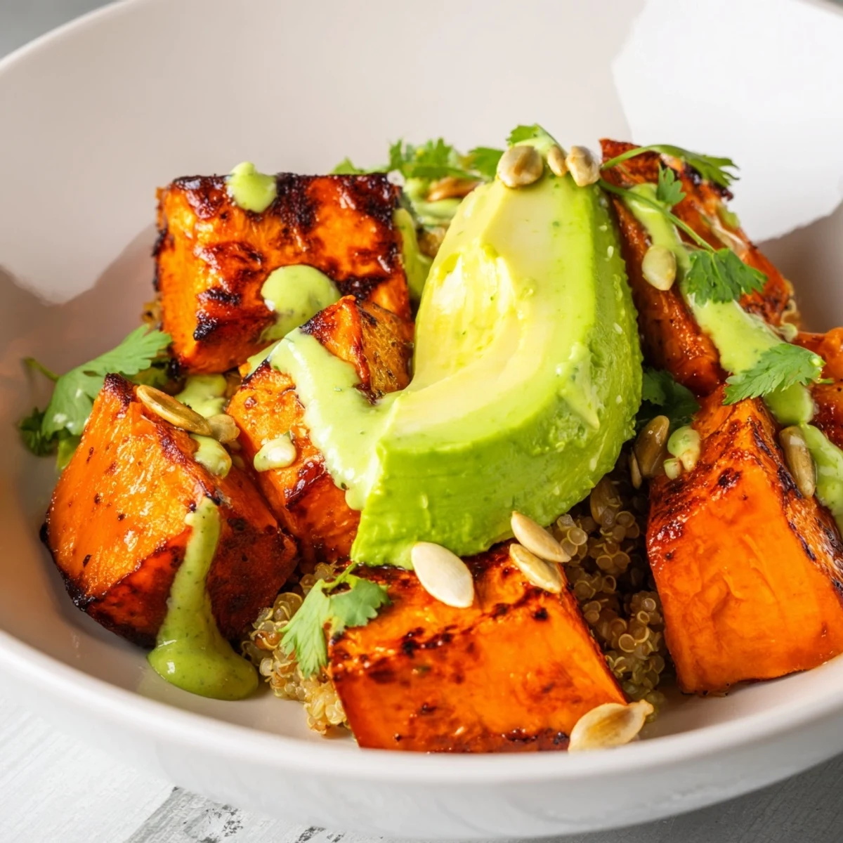 Yes, you can prepare the roasted sweet potatoes, quinoa, and dressing up to 2 days in advance. Store them separately in airtight containers in the refrigerator. Assemble the bowls fresh and add avocado just before serving to prevent browning.