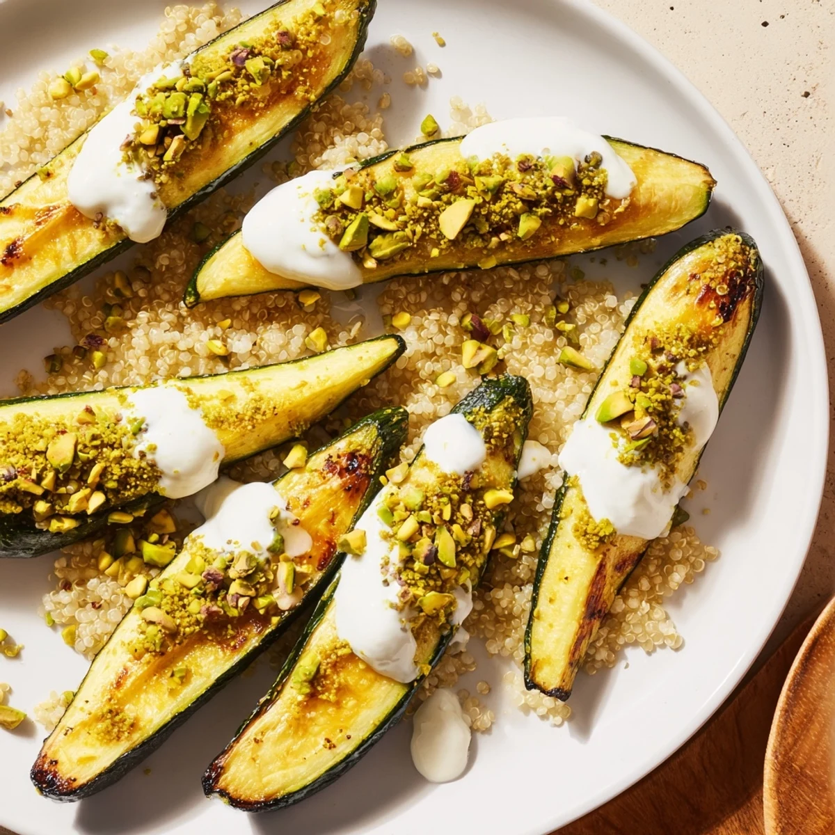 This Mediterranean-inspired grain bowl combines tender roasted zucchini, sweet cherry tomatoes, and red onion with fluffy quinoa. Fresh baby spinach or arugula adds peppery notes, while crunchy pistachios provide texture and protein. The crowning element is a bright lemon yogurt dressing made with Greek yogurt, fresh lemon juice and zest, garlic, and olive oil.