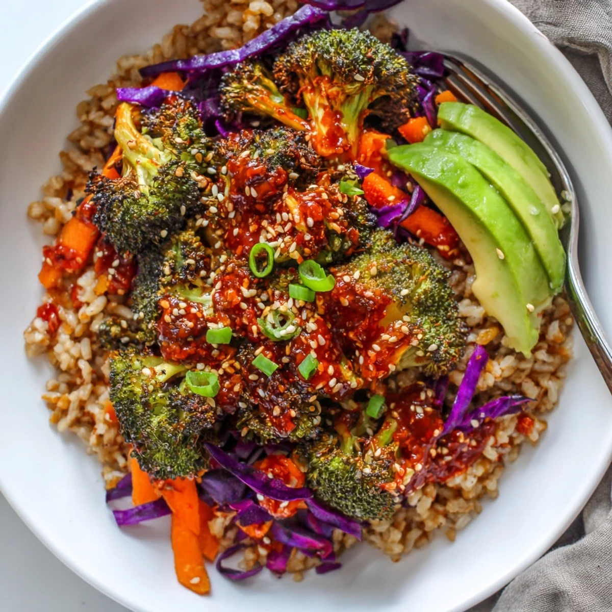This vibrant bowl brings together crispy roasted broccoli florets with tender brown rice or quinoa, creating a satisfying base. Fresh shredded red cabbage, julienned carrots, sliced cucumber, and creamy avocado add crunch and color. The star is the spicy chili crisp sesame dressing—whisk together chili crisp, toasted sesame oil, soy sauce, rice vinegar, maple syrup, and grated garlic for a drizzle that ties everything together. Top with green onions and toasted sesame seeds for extra texture. Ready in just 45 minutes, this bowl works perfectly for meal prep or a quick weeknight dinner.