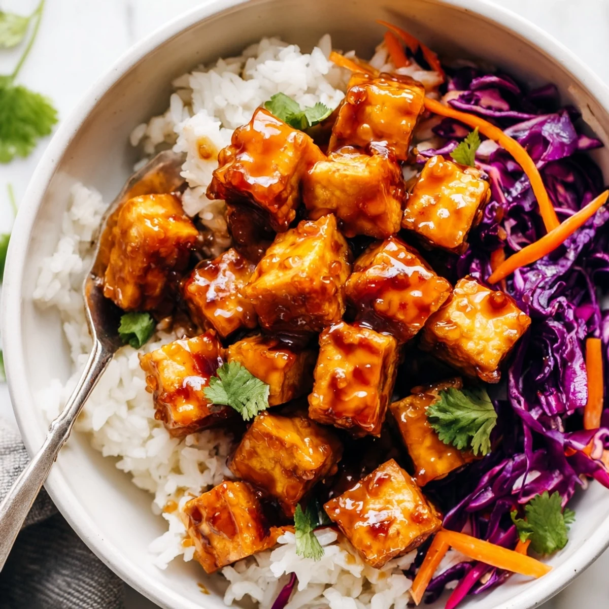- Scoop warm rice into each bowl, pile on that sticky glazed tofu, and spoon over any extra glaze from the pan. Top generously with the sesame slaw and finish with fresh herbs and a squeeze of lime.
