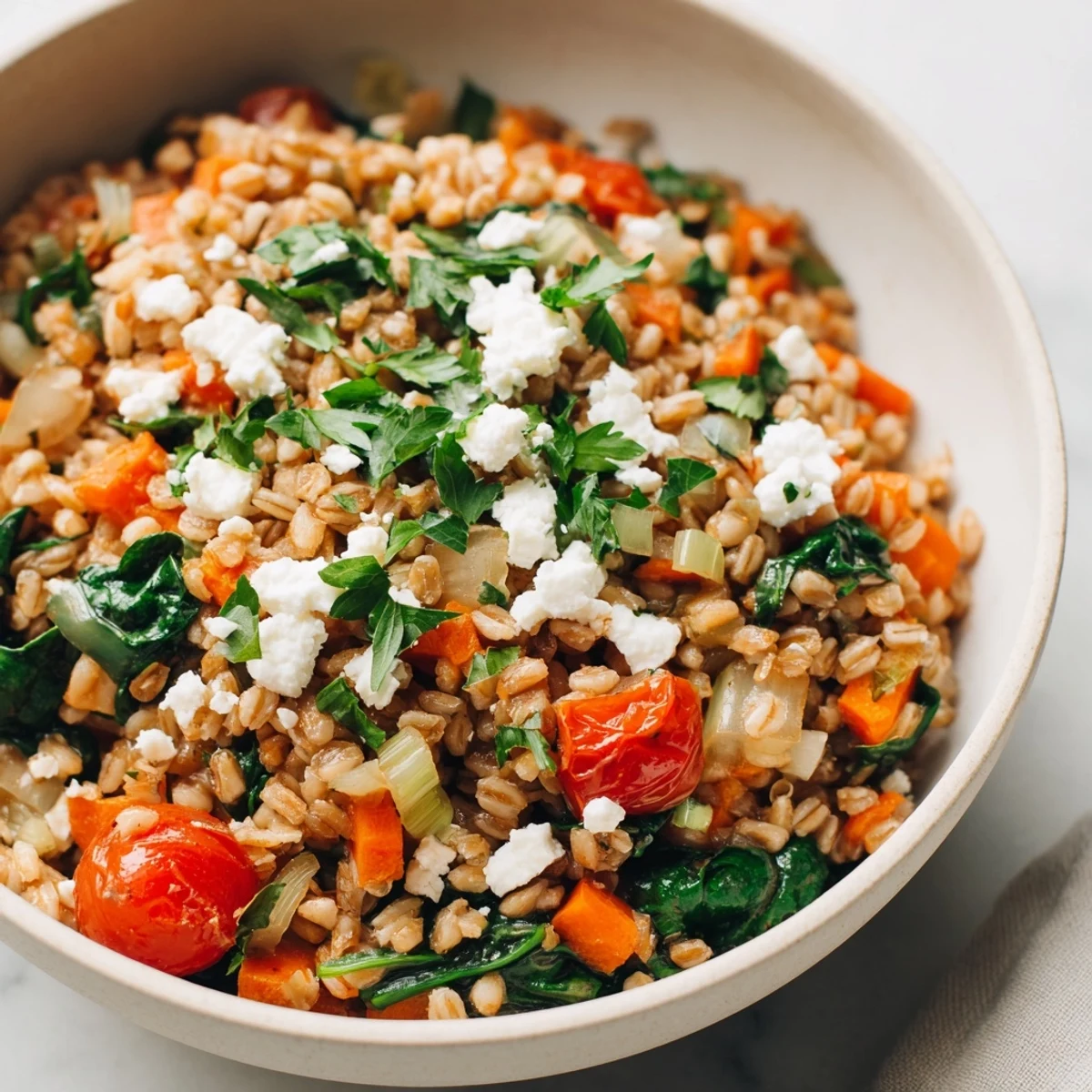 This dish features farro simmered until tender, then combined with sautéed onion, carrot, celery, and garlic. Cherry tomatoes and fresh spinach are stirred in, bringing vibrant color and flavors. Finished with lemon juice and parsley, it offers a warm, hearty meal bursting with Mediterranean-inspired notes. Optional feta adds a creamy touch.